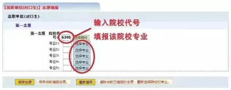 在院校、专业选择页面,考生点击所选志愿,系统会自动进行填写(输入学校代码6390,自动显示“郑州黄河护理职业学院”,输入郑州黄河护理职业学院的专业代号,系统自动会显示专业名称)。