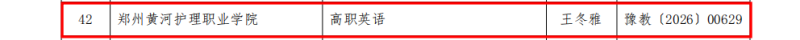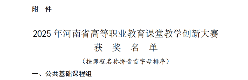 近日,河南省教育厅下发《关于公布2025年河南省高等职业教育课堂教学创新大赛获奖名单的通知》(教办职成〔2026〕19号),我校教师王冬雅荣获公共基础课程组三等奖,充分彰显了学校强化教学改革、深化内涵建设的显著成效。