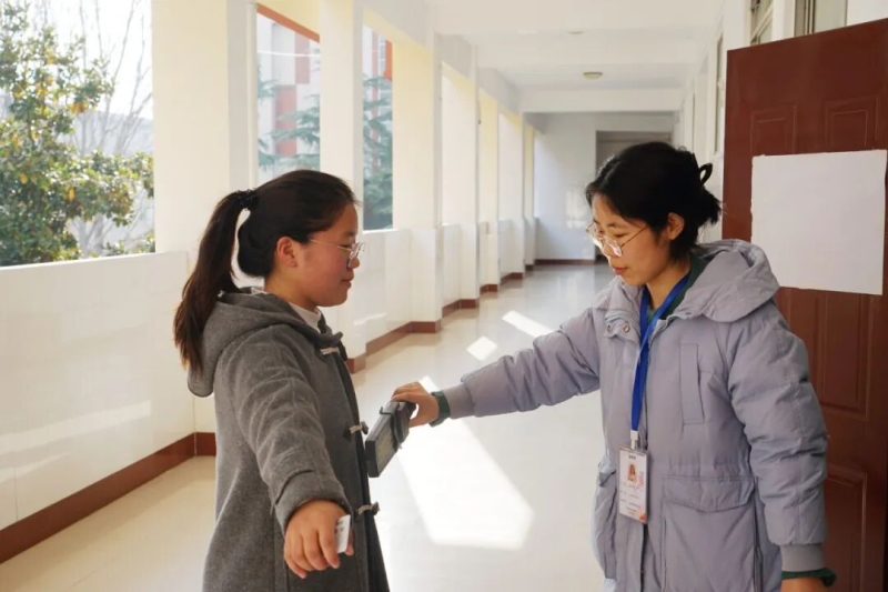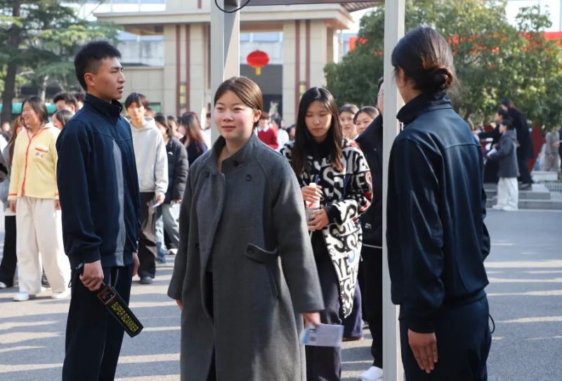 演练过程中,工作人员按照专升本考试要求和流程,有序组织考生列队通过智能安检门入校。监考人员手持金属探测器,对考生进行标准化入场检查,随后依次完成考生身份验证及文具检查工作。整场演练紧张有序、衔接顺畅。