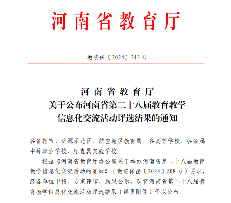 近日,河南省教育厅印发了《关于公布河南省第二十八届教育教学信息化交流活动评选结果的通知》(教资保〔2024〕343号)。我系钟怡赛、白红丽、王雪歌、张咪4位教师的作品荣获三等奖。