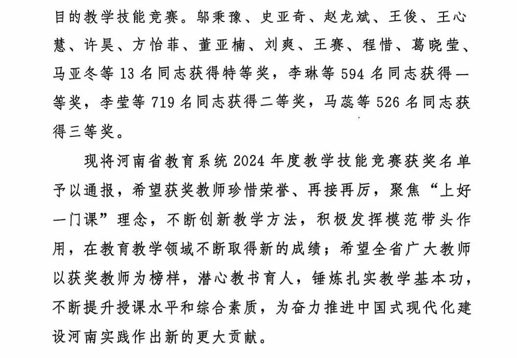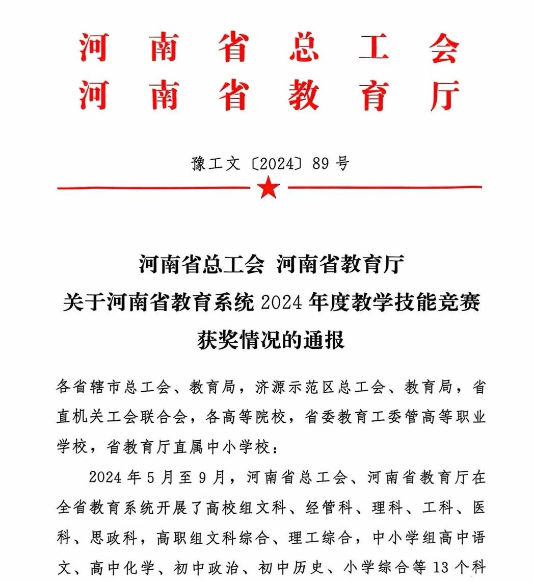 近日,河南省总工会、河南省教育厅联合下发了《关于河南省教育系统2024年度教学技能竞赛获奖情况的通报》(豫工文〔2024〕89号),我系许艺凡教师在2024年度教学技能竞赛中喜获高校文科二等奖。