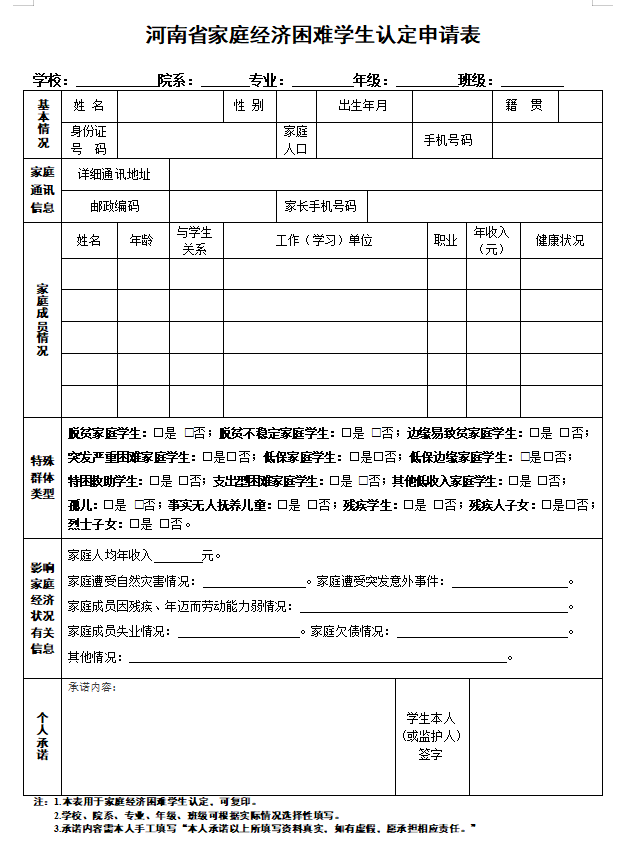 1.河南省家庭经济困难学生认定申请表