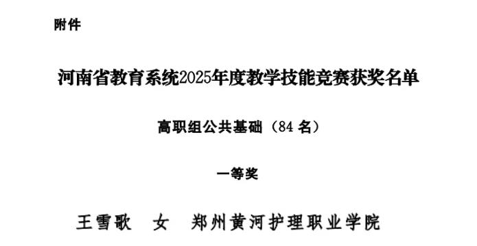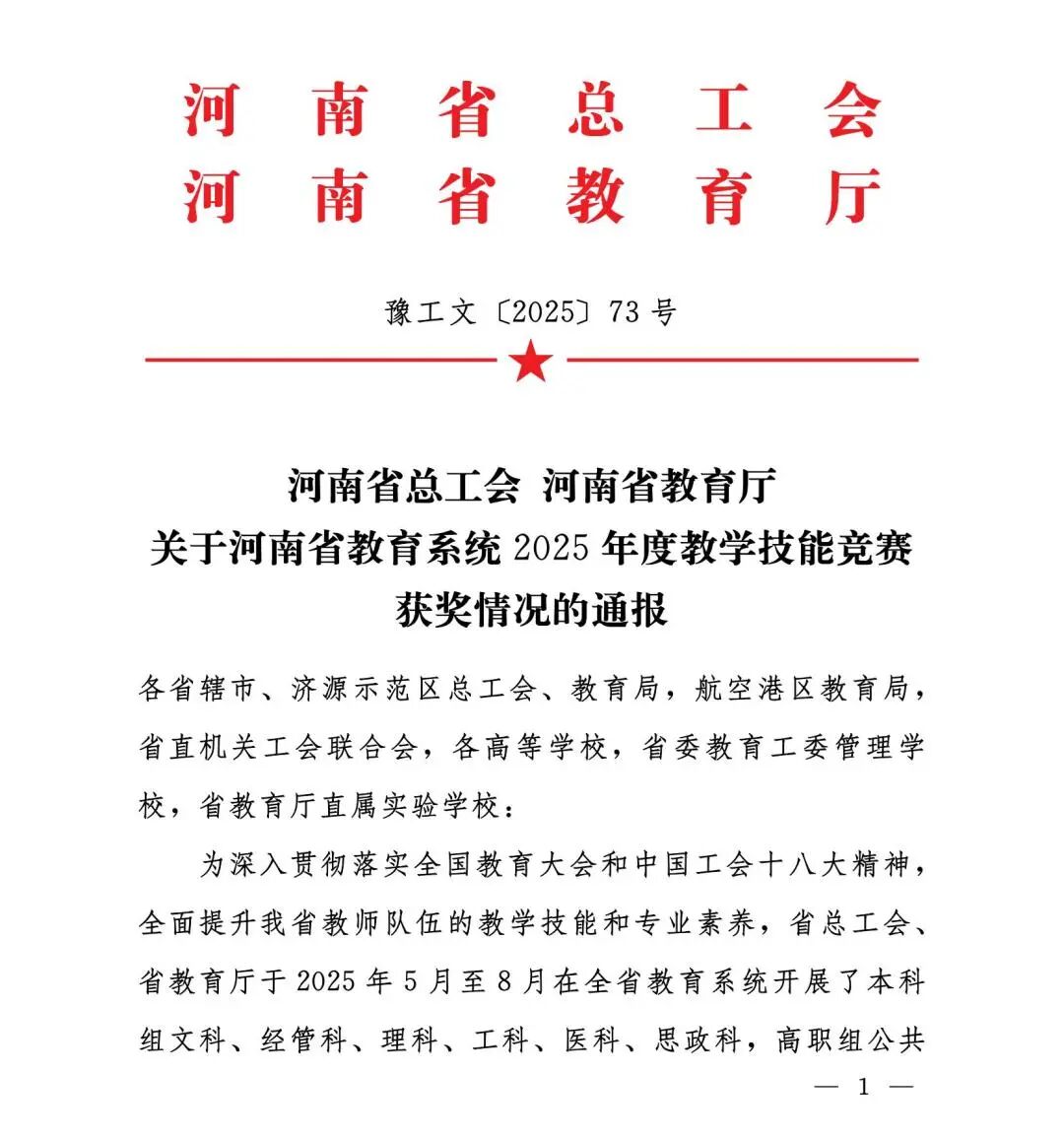 近日,河南省总工会、河南省教育厅下发《关于河南省教育系统2025年度教学技能竞赛获奖情况的通报》(豫工文〔2025〕73号),我院教师王雪歌荣获高职组公共基础一等奖,充分展现了我院教师的专业素养和教学风采。