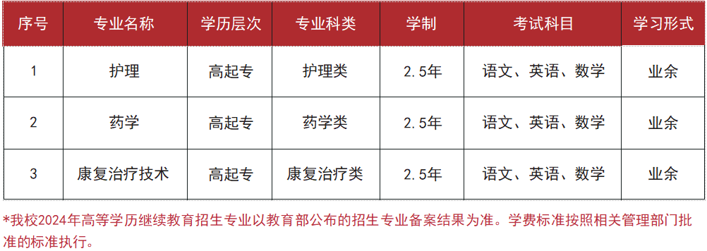 2024年我校开设高起专专业3个,学习形式为业余,学制为2.5年。