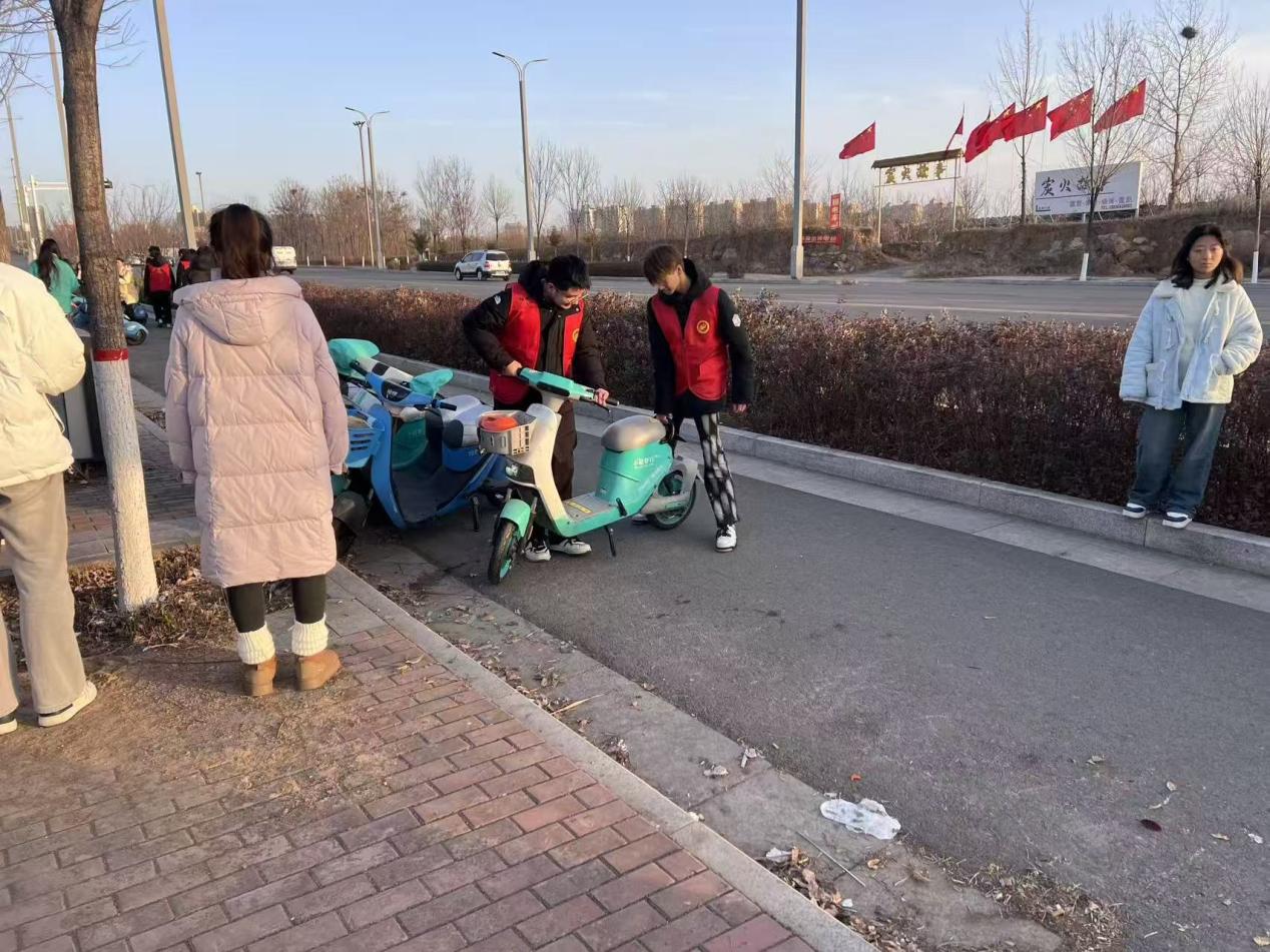 12月24日,中专部团总支,组织20名共青团员组成志愿服务队,开展校门口环境整治行动。志愿者们穿戴志愿者马甲,手持清洁工具,分成两组有序开展工作。一组志愿者针对校门口共享单车无序停放、占用人行通道等问题,按照整齐排列、朝向一致的原则,将散落各处的共享单车逐一搬移至指定停放区域,耐心整理歪斜车辆。另一组志愿者重点清扫校门口人行道、绿化带及周边区域的生活垃圾、落叶杂物,对卫生死角进行集中清理,同时向过往师生和市民宣传文明停放、爱护环境的理念。