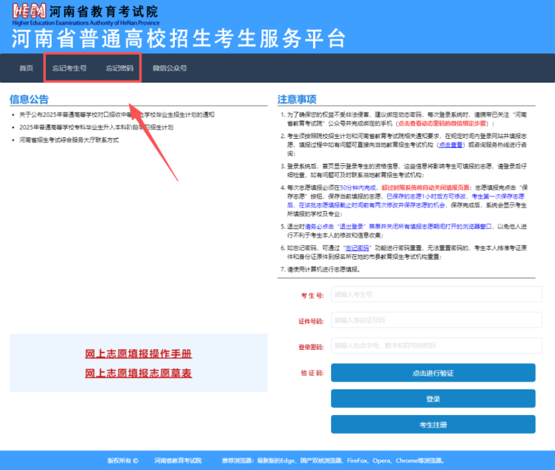 进入考生服务平台后,请仔细阅读“信息公告”区、“注意事项”区发布的政策公告和注意事项。