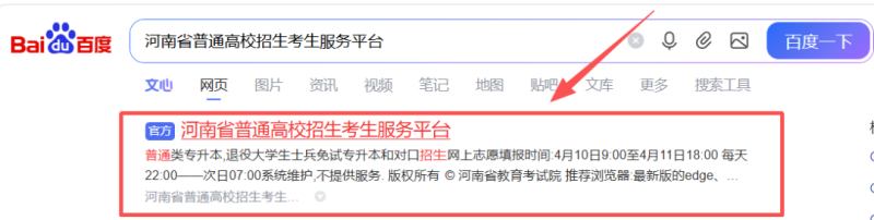 考生登录河南省普通高校招生考生服务平台(https://pzwb.haeea.cn/stu),或在搜索引擎中输入“河南省普通高校招生考生服务平台”,点击带有“官方”标识的网站。