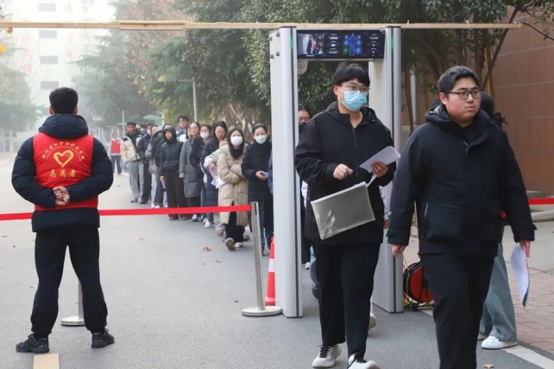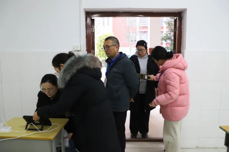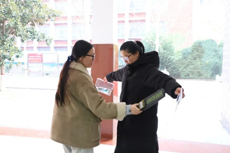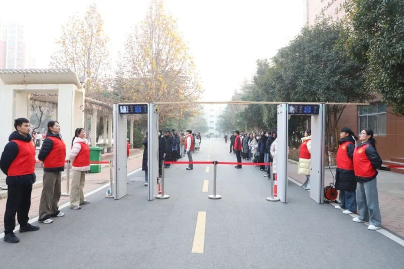 培训会后,我校进行了智能安检门入校和考场无声入场模拟演练。校领导对模拟演练进行了现场指导,工作人员严格按照考试要求和流程,组织考生列队通过智能安检门入校;监考员手持金属探测器对考生进行标准化入场检查,并开展身份验证与文具检查。整场演练紧张有序、衔接顺畅。