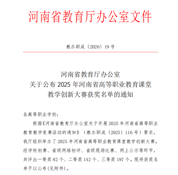近日,河南省教育厅下发《关于公布2025年河南省高等职业教育课堂教学创新大赛获奖名单的通知》(教办职成〔2026〕19号),我校教师王冬雅荣获公共基础课程组三等奖,充分彰显了学校强化教学改革、深化内涵建设的显著成效。
