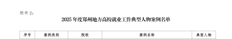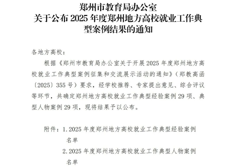 近日,郑州市教育局印发《关于公布2025年度郑州地方高校就业工作典型案例结果的通知》(郑教高函〔2026〕26号),我校2项案例成功入选,其中典型经验案例、典型人物案例各1项。